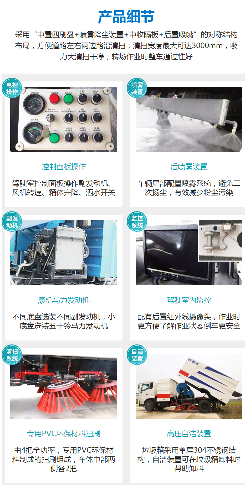 帶掃盤4把,江鈴副發動機;大力馬達;施耐德控件開關;臺灣電磁閥組;免維護自分離式離合器;免維護風機;不銹鋼水箱;不銹鋼垃圾箱;尾部LED箭頭燈;手動泵應急系統;刷臂轉動機構使用高新耐磨工程隔套,免打黃油;精密冷彎無縫液壓油管。