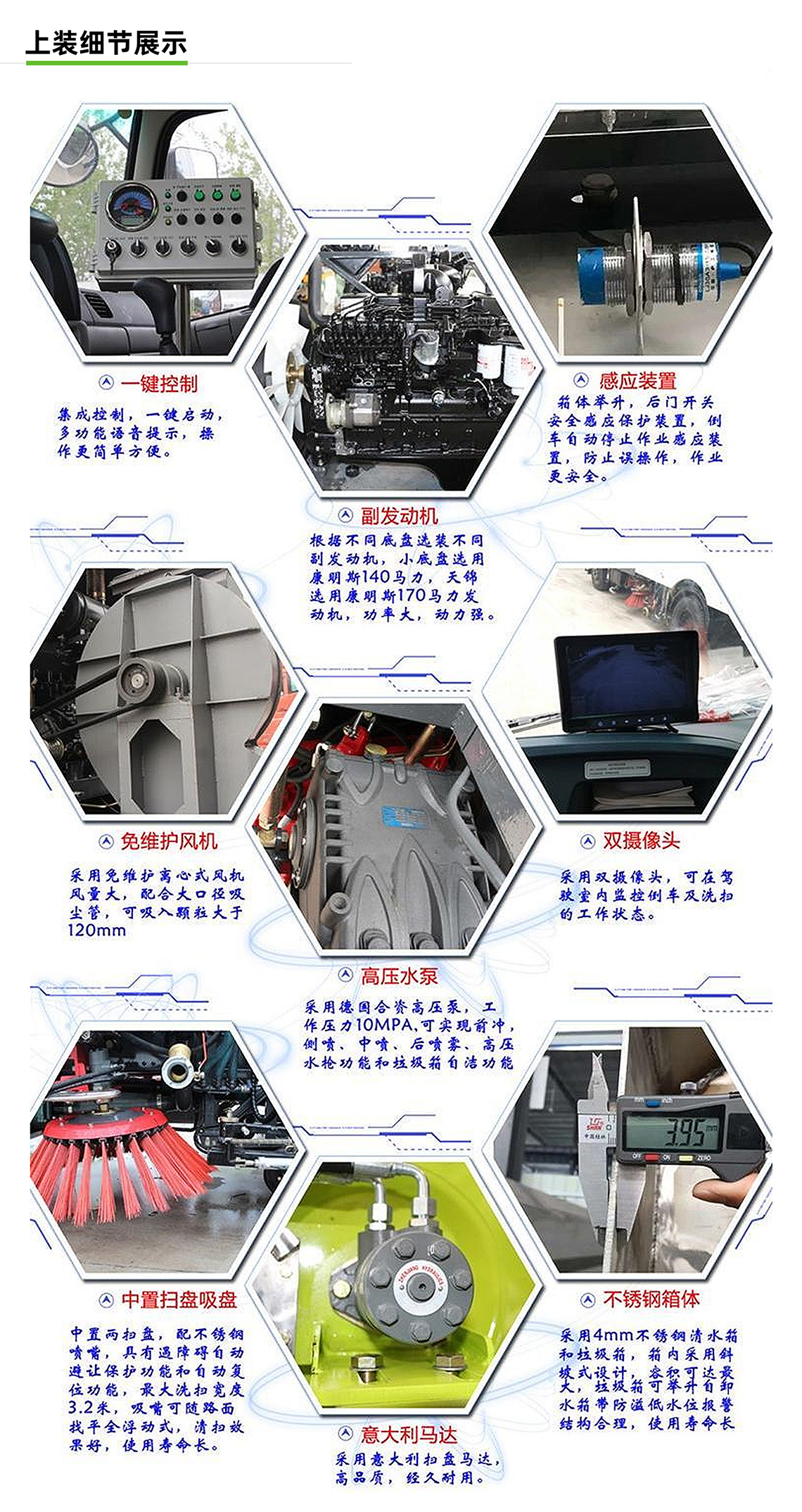 2:具有全洗掃作業、左洗掃作業、右洗掃作業、全掃路作業、左掃路作業、右掃路作業、全吸作業、左洗作業和右洗作業等9種作業模式可選。