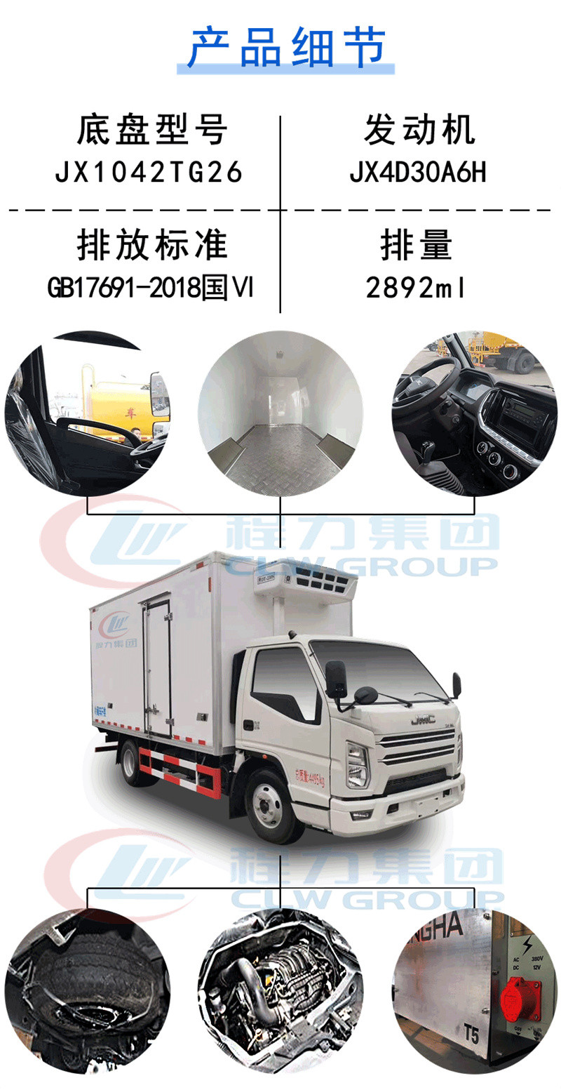 | 其他 | 車廂頂部封閉,不可開啟,導流罩為選裝件,選裝無側開門結構,選裝廂體側面開門樣式,選裝制冷量相同的制冷機組。ABS系統型號:APG3550500A,ABS系統生產廠家:浙江亞太機電股份有限公司;ABS系統型號: VIE ABS-II,ABS系統生產廠家: 浙江萬安科技股份有限公司。側防護采用冷彎型鋼/Q235-B,螺栓連接,后防護采用冷彎型鋼/Q235-B,焊接連接,后防護截面高度尺寸100mm,截面寬度尺寸50mm,下邊緣離地高度420mm。發動機型號/油耗申報值對應關系為:JX4D30A6H/11.4L/100km,JX4D30C6H/11.4L/100km,JX4D30B6H/11.4L/100km。 | ||